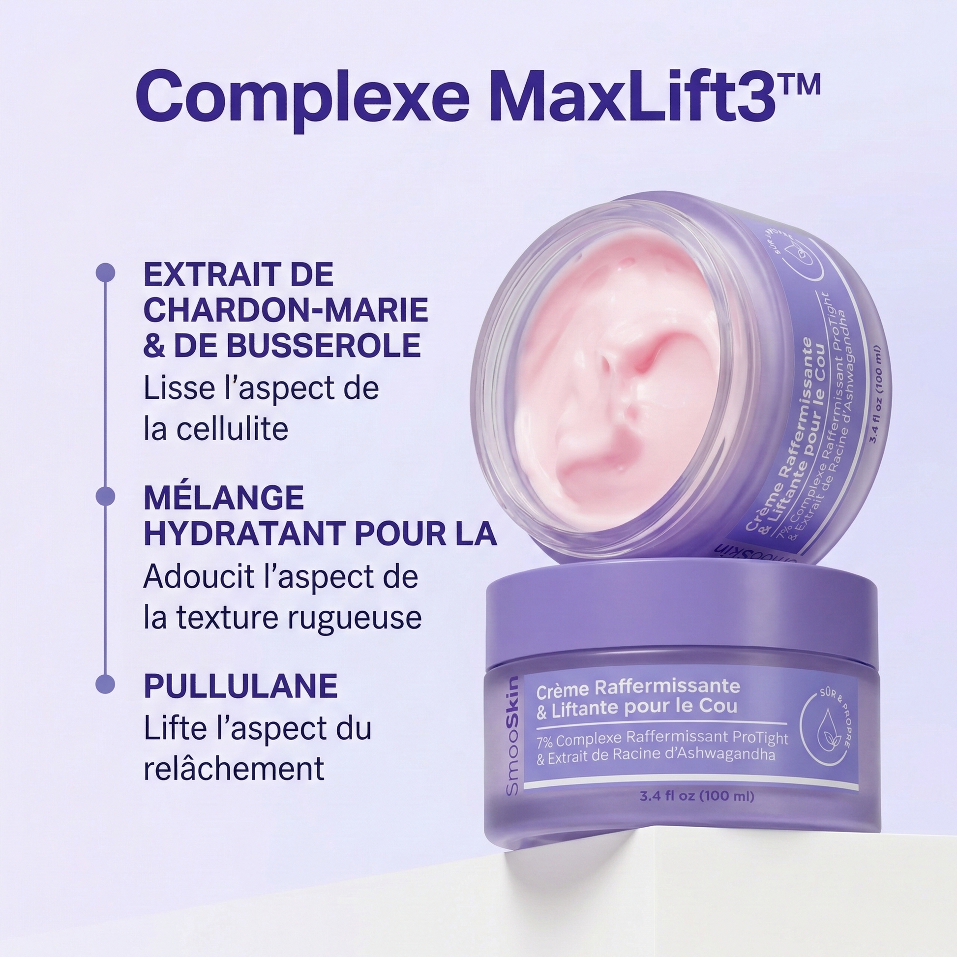 La Crème Raffermissante Smooskin est un soin ciblé qui aide à raffermir et tonifier la peau sur des zones spécifiques du corps, comme le cou, le ventre, les fesses et les cuisses. Formulée avec des Hexapeptides puissants et du Collagène, elle améliore l'élasticité de la peau, réduit les signes de vieillissement et hydrate en profondeur.